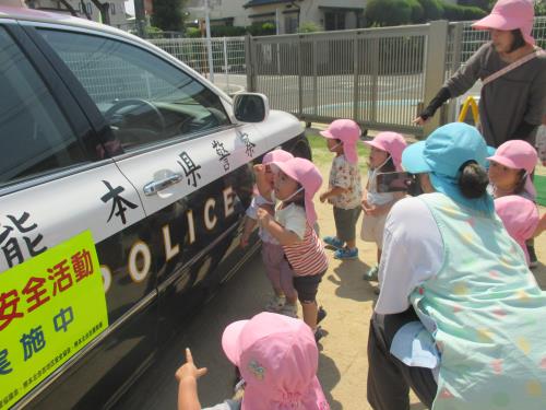 | | 横断歩道に足が出ていないかも確認しています | パトカーのきらきら輝く桜マークに興味津々です | こんなに近くで見ることも初めての1歳児さん。この経験が将来の夢につながっていくのかもしれません |