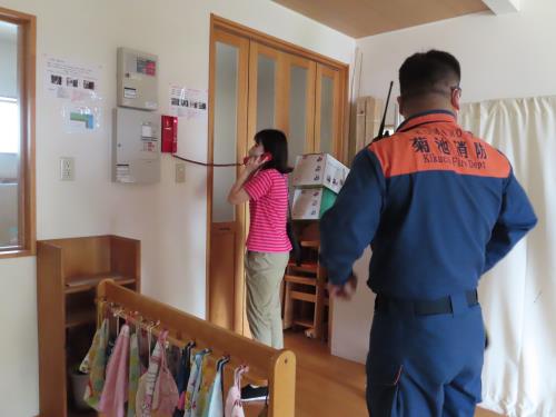 | | 今月は、消防署の方に訓練状況を見ていただきました。 | 通報訓練中の先生です。通報内容もしっかりチェックしていただきOKをもらいました | 毎月行う消火訓練です。「火災を知らせ、避難を促す」ことができていると褒められました |