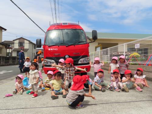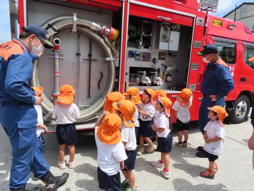 | | 消防車を間近で見学しました。何度見ても、不思議について知りたくなるようです | 噴射口を持たせていただき、最高に嬉しそうです | 「ここは何をするところですか」気になることすべて質問をしていました |