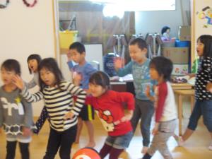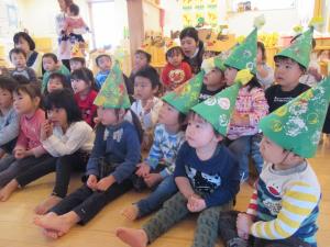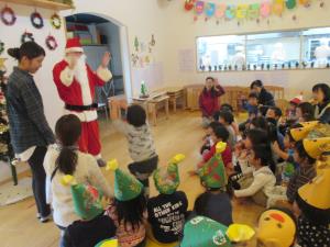 クリスマスの季節がやってきました!先日、保育園でもクリスマス会を行いました。 どりーむの部屋に集まり、クリスマスソングを唄ったり、職員によるペープサートを楽しんだりと賑やかに会が進んでいると、そこへ鈴の音に合わせて特別なお客様が!突然のサンタさんの登場に、子ども達から歓声が沸き、みんな大興奮。せっかくサンタさんに会えたのだから、ということで歳は?どこからきたの?と聞いてみたいことを質問してみました。その後、日頃唄っている「ドレミのうた」や「あたまかたひざぽん」の英語バージョンをサンタさんと一緒に楽しみ、「みんなとっても上手だね!」と褒めてもらいました。特別なお客様に聞いてもらうことができ、みんなとても嬉しそうでした。サンタさんとの時間はあっという間でしたが、最後には職員からの合奏のプレゼントもあり、普段目にしないグロッケンや小太鼓などの楽器の音色に小さいクラスの子ども達も耳を傾け、リズムに乗りながら楽しんでいました。季節の行事を知る中で、子ども達のイマジネーションが膨らむ会となりました。  |  |  | | 自分達で作ったとんがり帽を被って参加しました。 | れいんぼーさん歌のプレゼント! | 職員から、ペープサートを使ったクリスマスのおはなし。 |