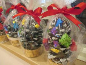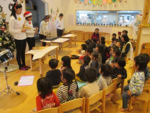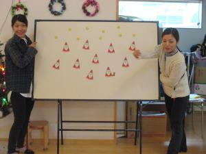 |  |  | | サンタさんとの時間はあっという間です。 | 「クリスマスソングメドレー」など、職員からの合奏のプレゼント。 小さいお友だちも最後まで座って参加できました。 | まつぼっくりを使った、子ども達の作品。 他にも近隣でみつけた木の実を沢山使った作品もできました。 |