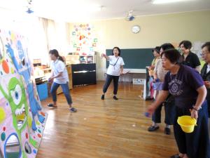 今年も夕涼み会の季節が来ました。 今回は、猛暑続きで夕方の気温が下がらず、急遽室内メインで会を進めることにしました。前日より、先生達とたくさんの保護者の方のご協力で準備を進め、各コーナーが設置され、いよいよ当日夕方、夕涼み会が始まりました。今年は受付にて、子ども達が作成したうちわも配りました。 地域の方々含め、日頃様々なご理解とご協力を頂いている皆様に夏の夕暮れ時を楽しんでいただくために、今年のテーマは「夏の虫」で、子どもたちと神輿やゲームコーナーで使う道具なども作成しました。毎年のことながら、先生達のアイディアがたくさん盛り込まれた、楽しい会になりました。 日頃の慌しい時間を忘れ、みなさんとの交流を図りながら笑顔あふれるひと時になったのではないでしょうか。 ご協力いただいた皆様、ありがとうございました。  |  |  | | 今回も手作り提灯で雰囲気作り。 | 神輿にも様々な昆虫たちがやってきて、会を盛り上げてくれます。 | サリーたちもお出迎え。 職員手描きの的当ては、毎年大活躍です。 |