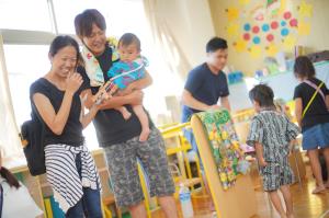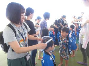 |  |  | 0歳児さんも、おうちの方と一緒に楽しめたかな? | ハチマキ付けのお手伝いを声掛けすると沢山のお母さま方が手伝ってくださいました。 | さあ、これからおみこしを担ぎます。 準備はばっちり! |