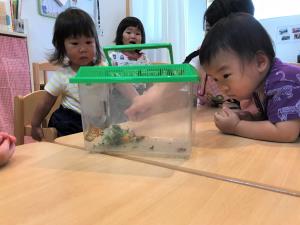 | | 1歳児さんも、幼虫を観察していましたが、ちょうちょうに変わった様子を、不思議そうに、じーっと覗いていました。しっかり様子を観察した後は、狭いカゴから広い空へ放しました。また、タマゴを生みにきてね! |