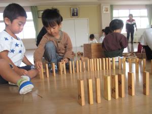 自由な遊びでは、さっそくドミノ倒しで楽しんでいました。
