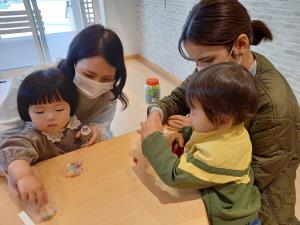 | 新型コロナウイルス感染症への対応のため、中断しておりました『杉並台キッズタウン未就園児くらぶ』を再開しました。小グループで行っているEiくらぶでは、今回4組の方々にご参会いただきました。 久しぶりの活動で、いつも以上にわくわく♪ 自己紹介や、絵本の読み聞かせ、手作りおもちゃ作り等を楽しみました。 コロナ禍の中、様々な制限等に苦慮されているお子様と保護者の皆様にとって居心地のよい場所となるよう、今後も工夫しながら園開放を行いたいと思います。興味のある方は、各園の『未就園児教室』より予定を確認できますので、是非ご参加ください。