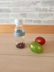 |  | | 今回は小さい子向けにミニサイズのペットボトルを用意しました。ビーズや鈴など、音が鳴るように好きな物を入れて、誤飲防止のため、ふたが外れないようにしっかりテープで止めたら出来上がりです。 | ビーズなど装飾用のもの以外に、どんぐりや小豆など自然物を使っても楽しめますね。 |