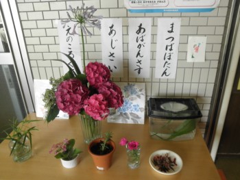今日は6月生まれさんの誕生会でした。つゆの晴れ間でお日様もお祝いしてくれたようです。先生たちからのプレゼントは影絵でした。にじが見たいうさぎさんのためにきつねさんは一生懸命練習してにじに化けました。それとは知らないうさぎさんはしっぽのついたにじを見ながら、いつまでもきつねさんを待ちました。年長さんの6月の歌『にじ』のように心がやさしくなりました。今月の花はお友だちが誕生会に合わせて持ってきてくれた『あじさい』と『えのころぐさ』園庭に咲いていた『あばがんさす』と『まつばぼたん』です。あじさいは色だけでなく、種類もたくさんありますね。白い額あじさいもきれいです。