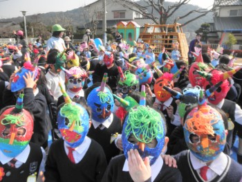 幼稚園ではみんなの身体の中にいる病気鬼、いやいや鬼、泣き虫鬼、おこりんぼ鬼などを追い払って元気で頑張る子どもになろうと豆まきをしました。年長さんは風船を使って張りぼての鬼の面を作りました。