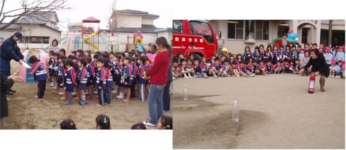 年長さんは幼年消防隊として1年間勉強してきましたので、消防署のおじさんから修了証書をいただきました。小学校に行っても防災の約束をしっかり守ってがんばってくれることでしょう。年長さんのハッピは以前消防署から頂いたものです。年中さん、年少さんはそのかっこいい姿にあこがれています。