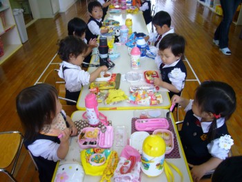 20日(月)からお弁当が始まり、また楽しみが増えたようです。満3歳児クラスのひよこ組さんは、登園後すぐにお弁当を広げ「待ってぇ」と担任から止められションボリ・・・。待ちに待ったお弁当の時間には、食べやすいように小さくかわいく握られたおにぎりが入った愛情一杯のお弁当を美味しそうにほおばっていました。お母様の手作りお弁当は、子ども達にとって心身ともにパワーになっています!毎日のお弁当作り大変ですね!お疲れ様です。