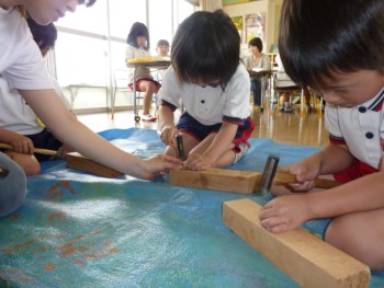 部屋遊びが多くなるこの時期、年長組では、木工あそびを取り入れています。