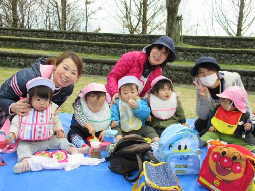 |  【お別れ遠足】    今日は子どもたちが楽しみにしていた遠足でした。  みんなで飯高山に手をつないで歩いて行きました。  広場に着くと、何をするのかな~とワクワクする子どもたち。  みんなで体操したり、ゲームをしたりと身体をいっぱい動かしました。  身体を動かした後は、子どもたちが最も楽しみにしていたお弁当の時間!  「僕のお弁当、アンパンマンだ~!!」「ハートの卵焼きが入ってる!!」と、みんなそれぞれに自分のお弁当を自慢していました。  お迎えの時に「お母さんお弁当ありがとう」と感謝の言葉を伝える姿も…。  みんな保護者の方が作ってくださったお弁当が嬉しかったんでしょうね。