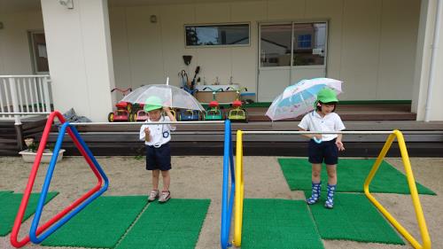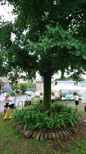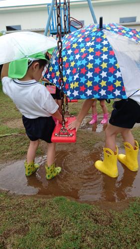 みんなで傘のさし方について話し合い、危険のないよう傘をさして雨の日の戸外へ・・・。傘に落ちる雨音を聴いたり、園庭の鉄棒やフェンス、遊具についている水滴を発見したり、草花や野菜についている水滴を指に落として遊んだり、水溜りの中に入って楽しんだりと雨ならではの遊びを楽しんでいます。