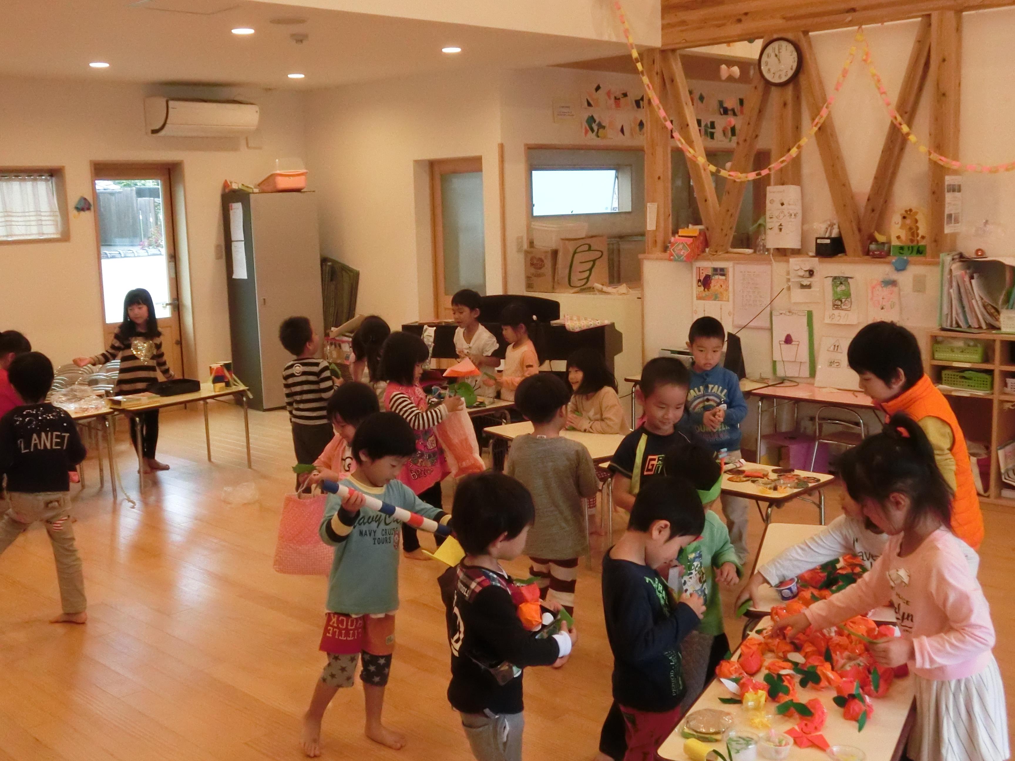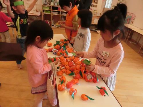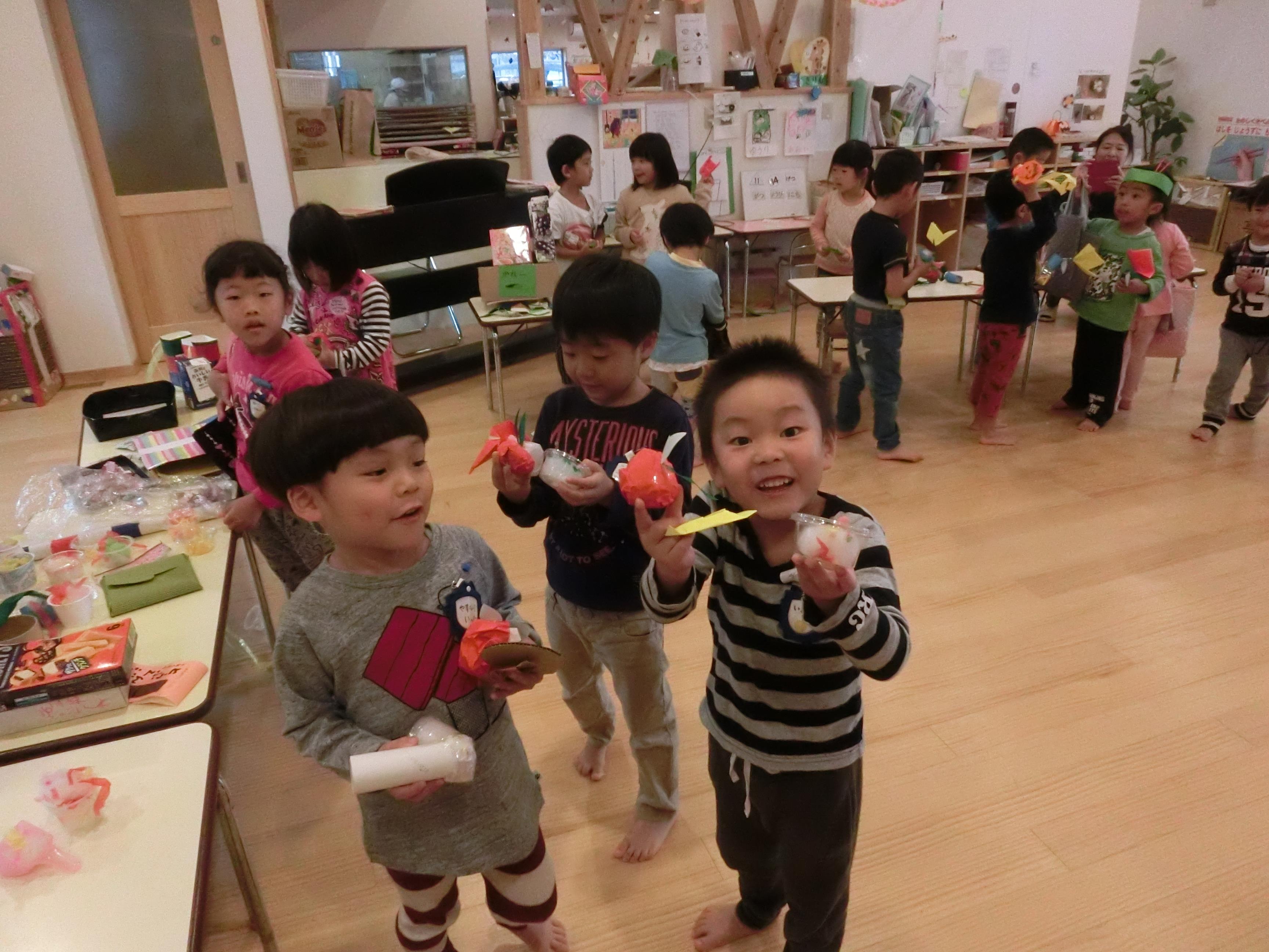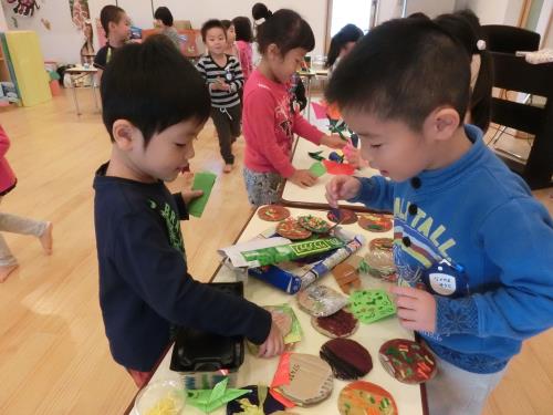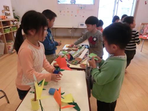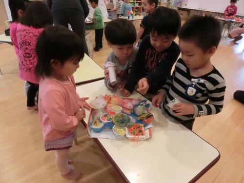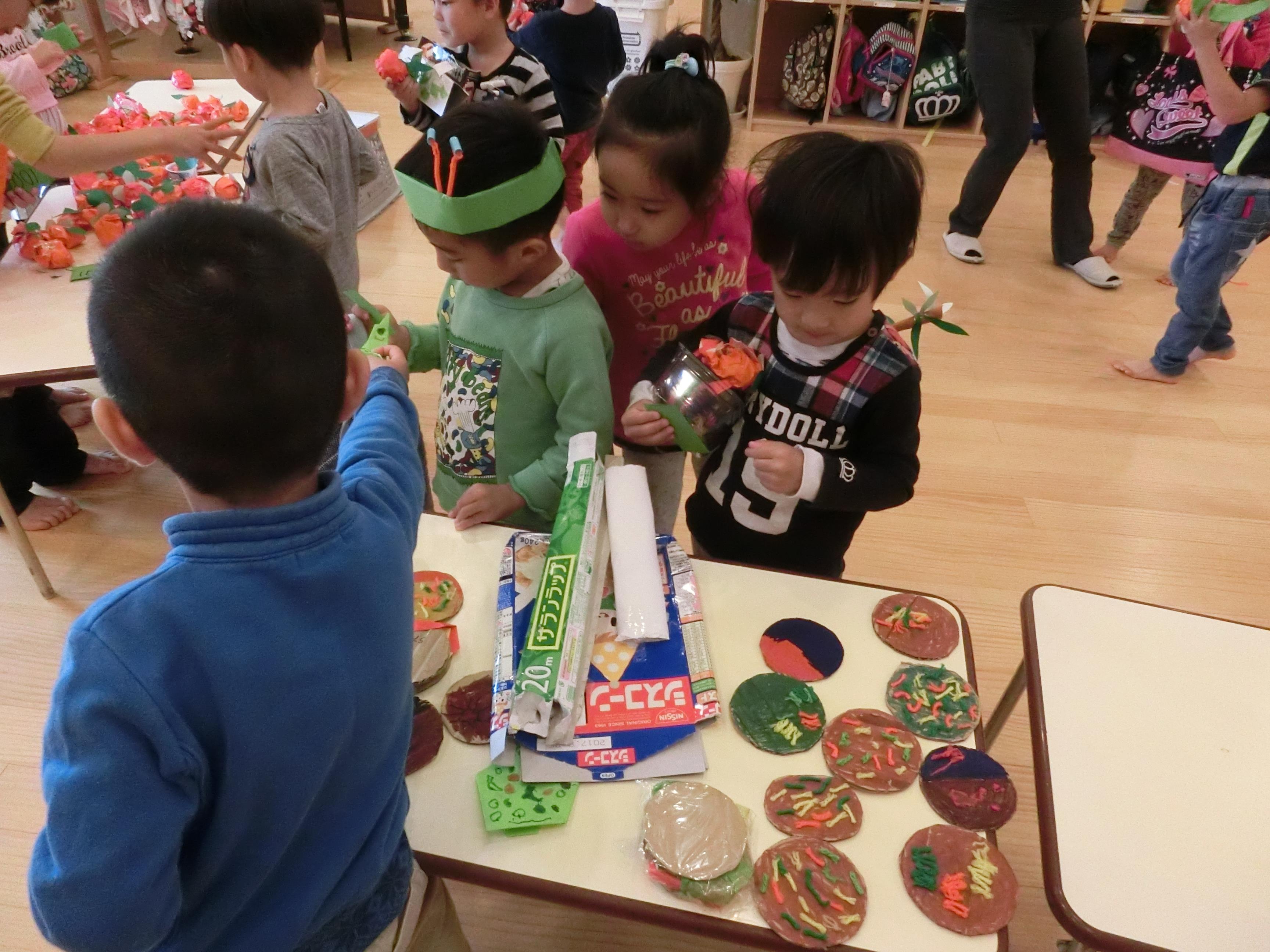 年中、年長組合同でおみせやさんごっこを行いました。何日かに分けて品物や、お金も作り、 売り手・買い手の両方を経験しました。子ども達が「ピザを作りたい!」「お花屋さんがあったらすてきだね」「ハンバーガーもいいね」と積極的に意見を出して、様々な素材の中から自分たちで考えながら切ったり貼ったりして真剣に作り上げました。  |  |  | どれにしようかな? | 「これください」 | 「いくらですか?」 「お花は○○円です」 |
