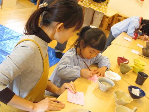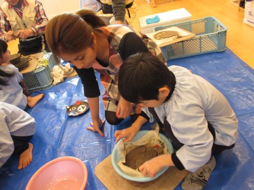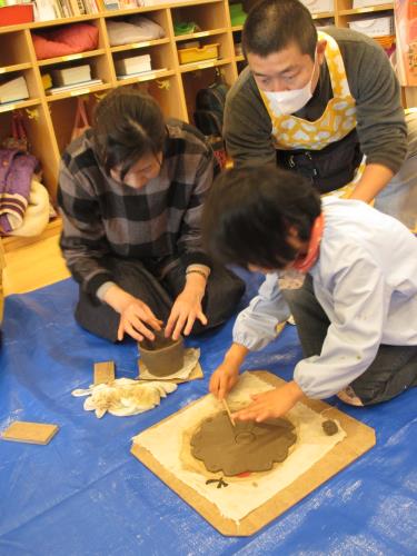 中武先生のご指導のもと、こども達も保護者の方も一緒に楽しみながら作ることが出来ました。「土は触るほど答えてくれるからね!!」と中武先生から素敵な名言をいただき、こどもも保護者の方も更に真剣な表情で作っていました。数日置いて、窯で焼き、時間をかけて素敵な作品になることを知り、更に期待が高まったこども達!!卒園式の時、出来上がってくる作品に会えるので、今から待ち遠しいですね。