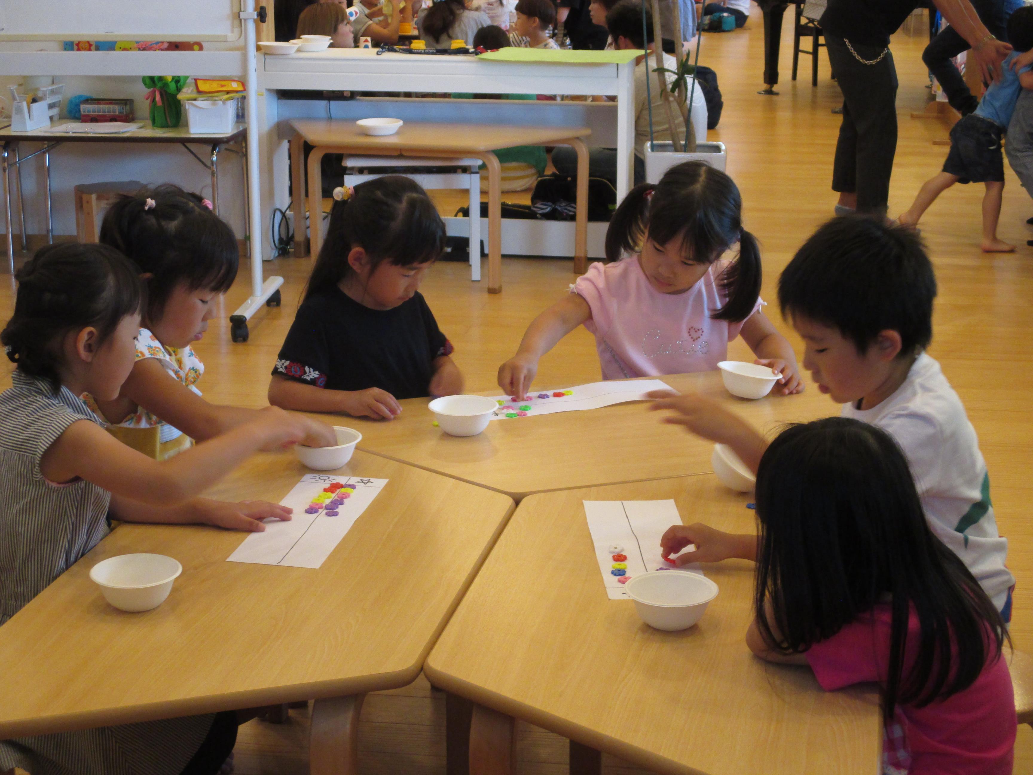 |  |  | 自分で数えて、10個ずつにしたよ。お友だちは、間違えてないかな?〈5歳児〉 | 「じゃんけんおはじき」ゲームをしました。負けないようにみんな真剣ですね。〈5歳児〉 | さあ!どちらが勝ったかを確認します。並べ方や、貼り方も自分達で考えます。〈5歳児〉 |