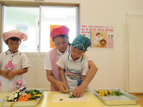 夏のお楽しみ会~クッキング・タイム~ 次は、クッキング・タイムです。お昼寝もしっかりして、元気回復!! ぞう組さんはしっかり話を聞いて野菜の切り方を覚えます。ねこの手のように自分の手を丸めて、手を切らないように気をつけます。野菜を切って中の種を観察しました。ピーマンの種やナスの種、カボチャの種を観察し、種の色やつき方を見比べたりしました。また、ニンジンの種を見ると・・・「ないね・・・。」何故かな??と疑問も出てきました。その何故かなという理由も年長ならではですね。みんなで今度考えてみよう!!という結論になりました。考えて答えを導きだすと、きっとみんなの心に残るはずです。 みんな、エプロン・三角巾がとっても似合っています。少しお母さんになった気分で、ドキドキしながら順番を待ちます。上手に切れるかな?美味しいカレーが出来るかな?きっとみんなの気持ちがぎゅっと詰まった美味しいカレーが出来上がるはずです!! 実は・・・ぞうぐみさん、野菜を切るのは7月になって3回目です。最初はプランターで育てているオクラを切ったとき。2回目は、うさぎ組さんから分けてもらったナスを切ったとき。そして今回で3回目!!いろいろな野菜を切ります。もちろん、こども園で収穫した野菜も入っていますよ!! ナス、ピーマン、人参、かぼちゃ。種の付き方、野菜の硬さ、色、比べてみるとそれぞれ違う事も分かりました。 給食室に「おいしくしてください!!」とみんなで持っていきました。 夜の給食が楽しみです♪  |  |