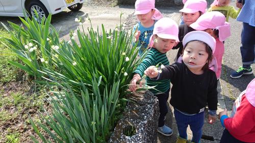 寒かった冬が嘘のようにすっかり暖かくなり、周りの木々も芽吹き始めました。2歳児うさぎ組は、飯高山に散歩に出かけ、たくさんの春を発見してきました。冬の間、散歩に行くときは、木々を見て、「はだかんぼうだね」と木に葉がない様子を観察していたこども達ですが、今回散歩に出かけると、以前梅の花が咲いていた木が緑の新芽になっていたり、ユキヤナギの花が真っ白に咲いていたり、こども達も「雪みたい!!」と変化に気付き言葉を発していました。また、飯高山の桜も咲いていたり、タンポポの花や綿毛を発見したり、こども達と季節の変化を感じることができました。 展望台に登る際も、以前に比べ体力がつき、石段を登るスピードも早くなり、成長を感じました。登っている途中、蟻を発見し、「ありだ!!」と、みんなで顔を寄せ合って観察したり、餌を運んでいる様子も見ることができ、「暖かくなったから、起きてきたんだね。」と、春を感じる出来事でした。 一年前は、誘導ロープを握って散歩に出かけていたうさぎ組のこども達でした。しかし、今では友だちと手をつなぎ、会話を楽しみながら歩いたり、車が来たら、「車だよ」と互いに教えあって立ち止まったり、道路を渡る時は、自然に手をあげていたり、みんなで歌いながら歩いたり、花や草花に気付いたり・・・この一年で五感をたくさん使って様々な経験をすることができました。 もうすぐ、3歳児ぱんだ組へ進級します。今からワクワクのこども達!!成長が楽しみです。  |  |  | 「これ、なんだ?」 「すずらんって言うんだよ!!」 | 「雪みたい!!」 「ユキヤナギって言うんだよ」 | 「たんぽぽ見つけた!!先生とって~」 |