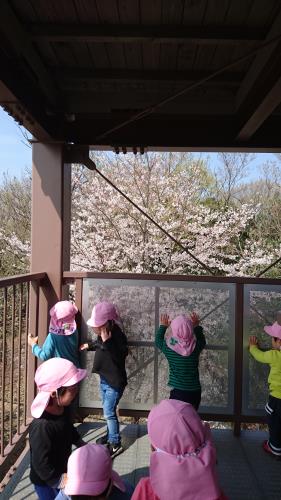 |  |  | 展望台の石段を登ったら、長い坂道を降りるよ。 転ばないように、自分達で考えて歩けるようになったよ。 「歩こう 歩こう 私は元気♪」さんぽの歌をみんなで歌っておりるのがお気に入り!! | 飯高山の広場隣にも、桜がたくさん咲いていたよ!!登って近くで見ると・・・「あっ、虫!!」こども達は、桜より、昆虫が気になるようです!! | 飯高山の桜は種類もあり、近くで見ると、とっても綺麗でした!! |