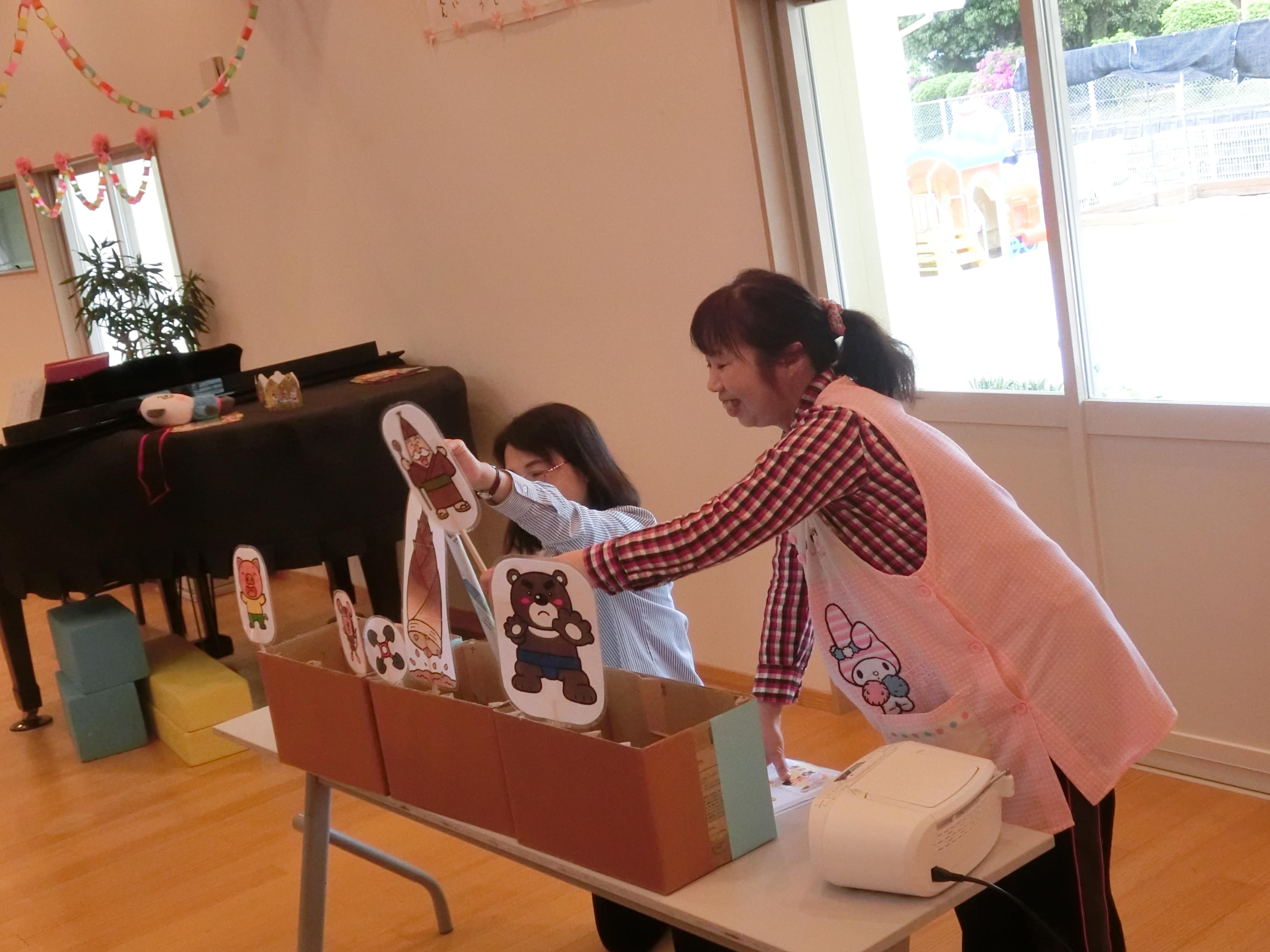|  |  | 先生との手遊び 「おちた おちた」 しっかり聞いておかないと、おへそをとられちゃうよ。 | 先生の楽しい話し方にみんな引き込まれてしまいました。 歌もあって楽しいたけのこ掘りが出来たね。 | 「たけのこ抜けろ~」 と、みんなで声の応援パワーをねずみさんに送ったよ。 抜けてよかった!! |