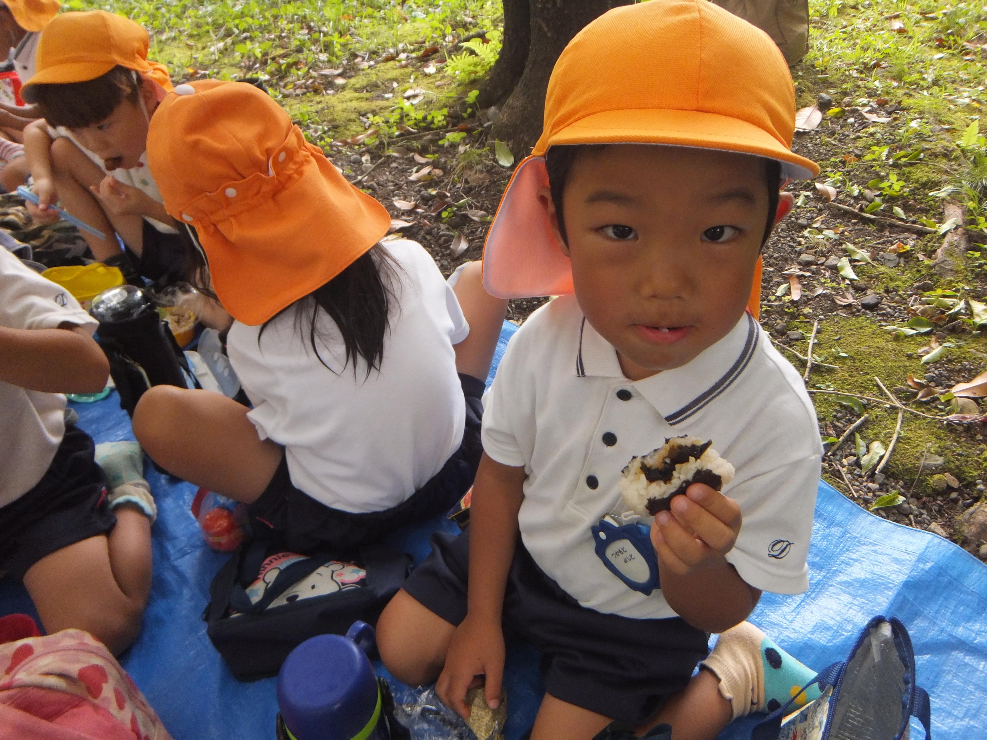 公園の木陰で昼食です。 お家の方の手作りおにぎりを前に「おなかがすいたね」と頂きますも待ち遠しいようです。 「ぼく。しゃけとこんぶ。」「わたしは三個あるよ」「おいし~い」 大きな木陰に「森みたいだね」と想像豊かに色々な体験をしています。子ども達の発想豊かな会話が楽しいひと時でした。  |  |  | 「こんぶ入ってた」 「おかあさんのおにぎり。ダだーいすき」 | 「みてみて!このおにぎり混ざってるんだよ」 | 「これ、二個目だよ」 パクパクと食べ進んでいました。 |