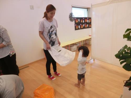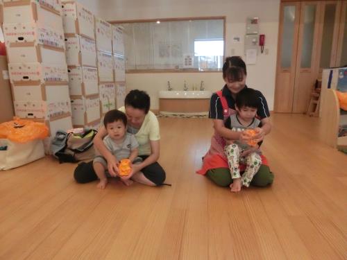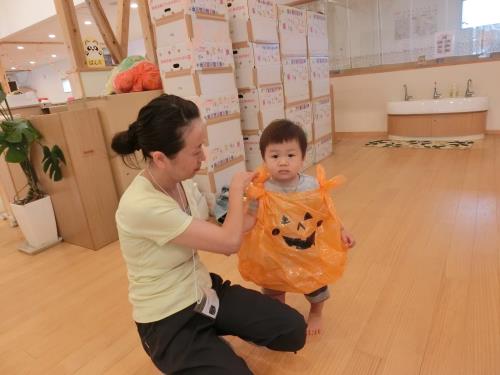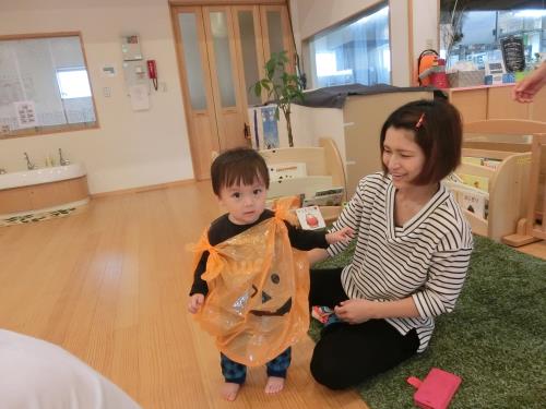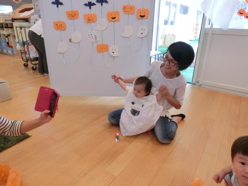 10月のいちごくらぶは、ひとつの活動に向けて「準備+実施」という流れで活動します。これまでは、1回ずつの経験に重点をおき取り組んでまいりましたが、今後園行事に参加することも踏まえ「ハロウィン」にむけて計画しました。 第1回目は「制作」でした。コスチュームを親子で作ったり、ゲームで使う用具(かぼちゃに見立てたボール)作り、飾りつくりをしました。どちらの衣装にしようか?顔はどうしようか?等々親子で会話をしながら楽しんで頂きました。「持って帰りたーい」コールに次回持参を約束して、今日の活動を終えました。さて!次回。どんな内容の活動が展開されるでしょうか。楽しみです。  |  |  | | お化けコスチュームでふわふわ風がやってきたね | オーナメントつくり お顔をかいて完成です | 新聞丸めて、かぼちゃボールつくったよ ころころころがるよ |