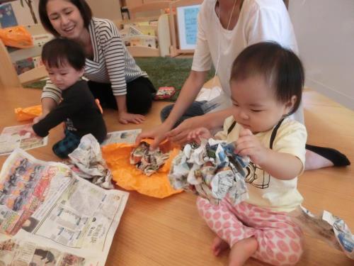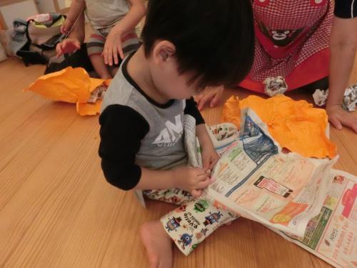 |  |  | 僕は一枚ずつ使うんだよ 指先で、新聞紙をめくる!体験中です。 | かぼちゃに変身! ちょっぴり緊張しています | 「ぼく似合うかな?まま」 パーテイーが楽しみだね |