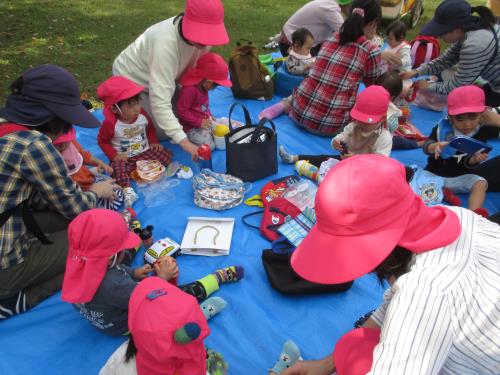 |  |  | うさぎさんも仲間意識が育ってきて、仲良く輪になって食べました。みんなで食べるとおいしいね。 | りすくみさんは自分でおにぎりをつまんで、ぱくぱく! ママのおにぎりさいこ~う! | こあらさんも月齢に合ったお弁当を作ってもらいました。 お友だちのお弁当気になるね |