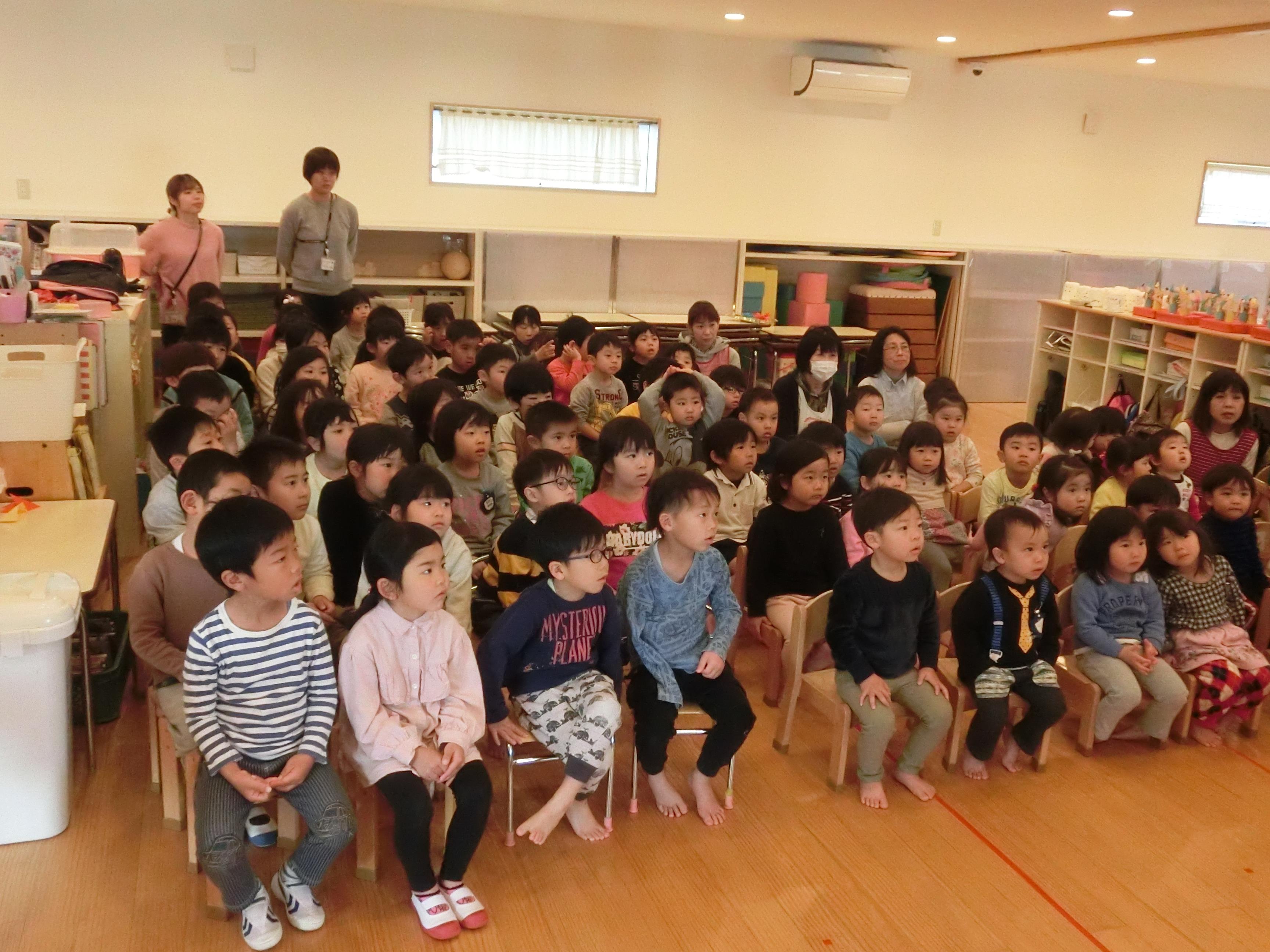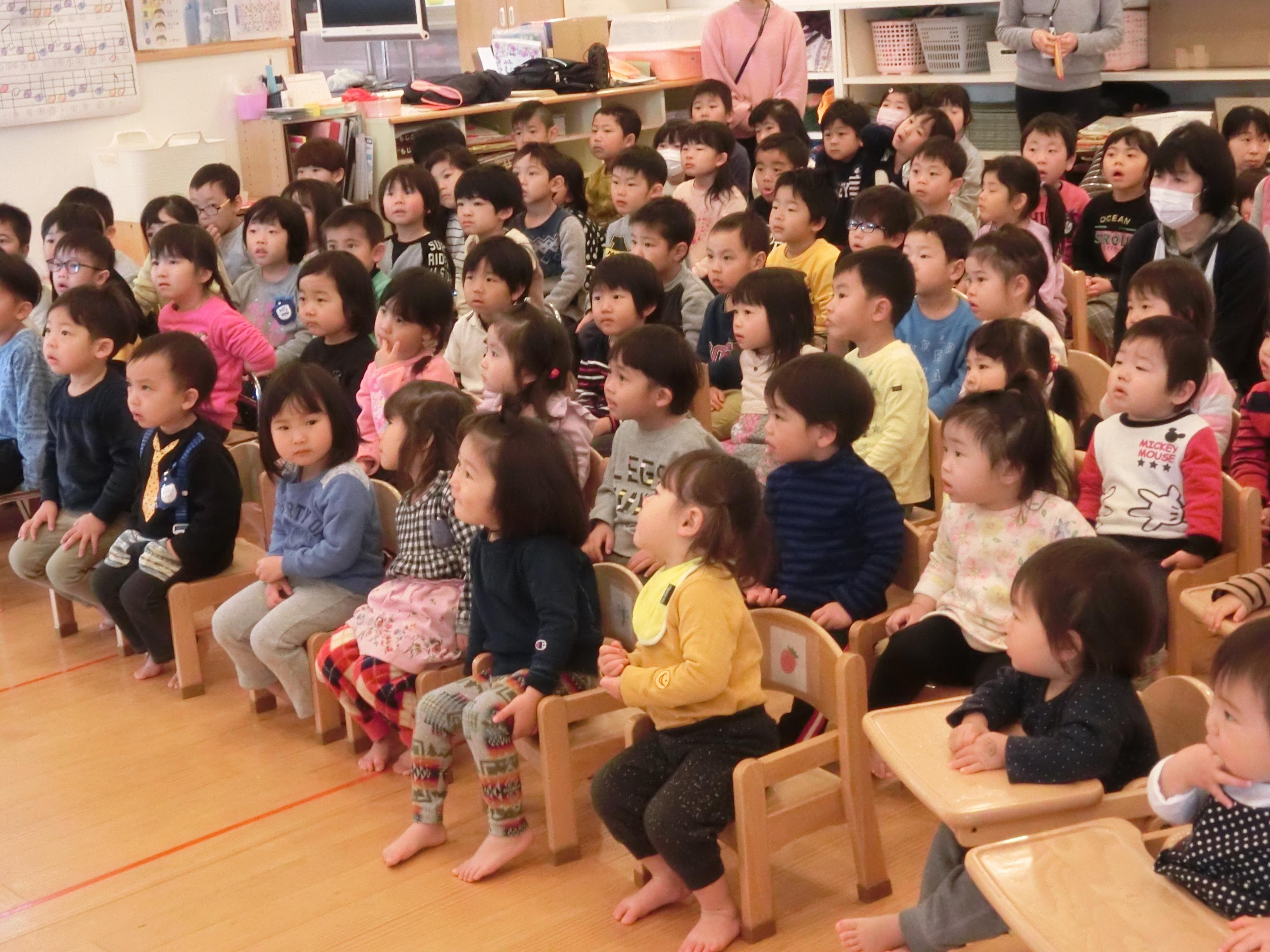 3月1日。年長組はこども園で経験する最後のひな祭り会に参加しました。 毎年ひなまつりを迎える時期は特に全職員で「子ども達の健やかな成長とこれからも誰にでも優しくできる人でいられますように」と願い過ごしています。 子ども達に「ひな祭りはどんなことをしているでしょう?」と聞くと「お雛様のお祝い」「綺麗な着物をきてること」等色々な返事が返っていきます。「実は・・・結婚式の様子なんだよ」と話すとより一層興味深く”由来”や”人形の紹介”を聞いてくれました。 会では由来の紙芝居をみたり、人形の説明を聞きました。各クラス制作した雛人形をみんなに紹介してくれると「かわいい」「上手だね」とお友だちの頑張りを認め合う姿が見られました。帰りには、保護者会で準備していただいた「ひなあられ」を大事そうに持ち帰っていた子ども達です。ご家庭でも、お子様の健やかな成長を願いお祝いをされた事でしょう。 おひなさま!また一年後お会いしましょう。  |  |  | | むかしは、人形を流して・・・先生手作りの紙芝居で由来を聞きました | こども園開園の時、方から譲っていただいたお雛様。今年も温かく見守ってくれます。 | 未満児さんもしっかりお話を聞くことが上手になっています。お雛様もきっと嬉しいはずです |