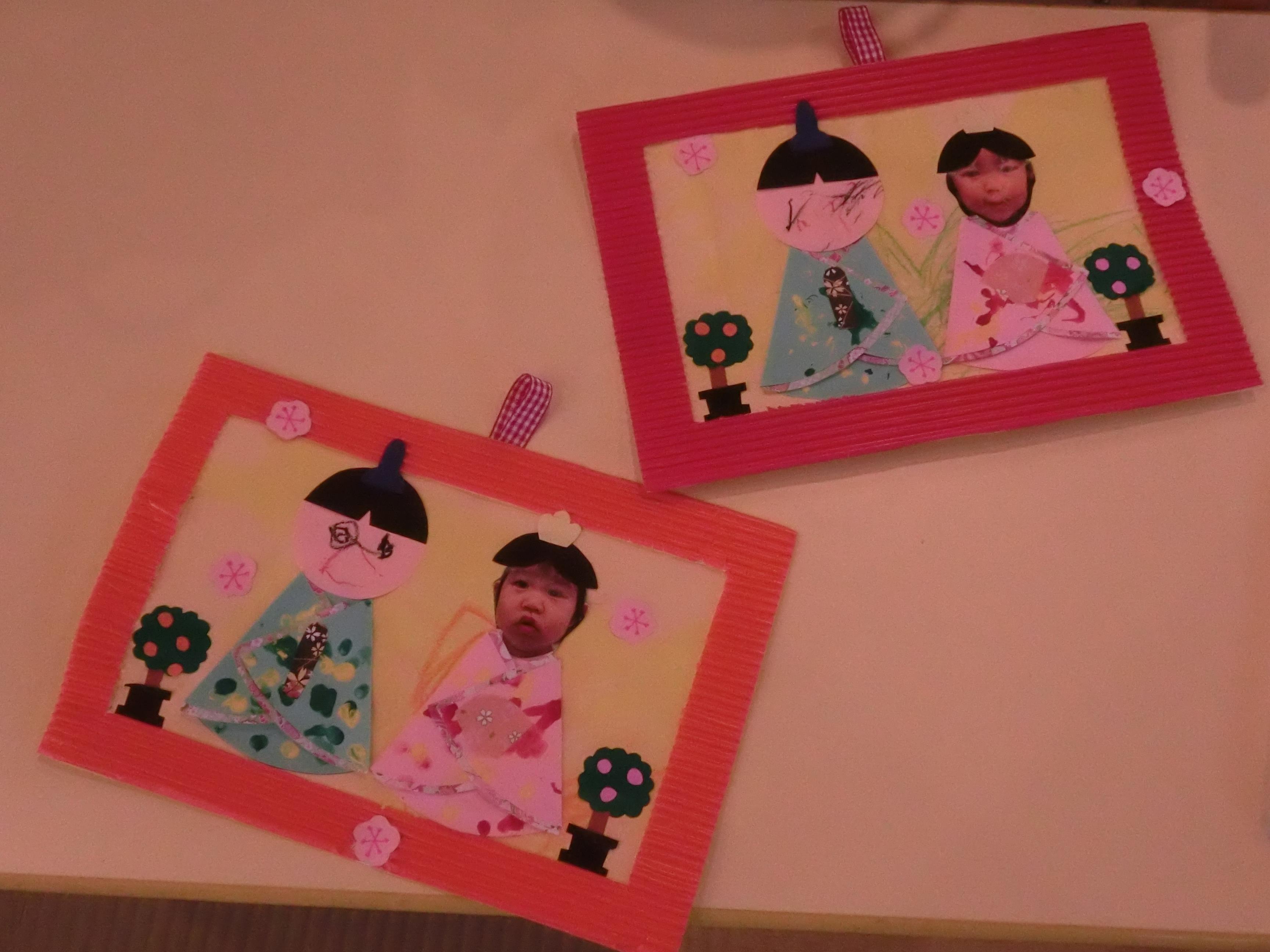 |  |  | | 2歳児。顔をどこに貼ったらいいかな?と構成を考えながら作っていました。上手に並んでいます。 | 3歳児。ヤクルトに花紙を巻きつけました。金のももの花に写るお雛様もなかなか風情があります。いろいろな表情のお雛様です | 4歳児。着物をふっくらとするところが難しい!といいながら作りました。着物の感じが出ています。 |