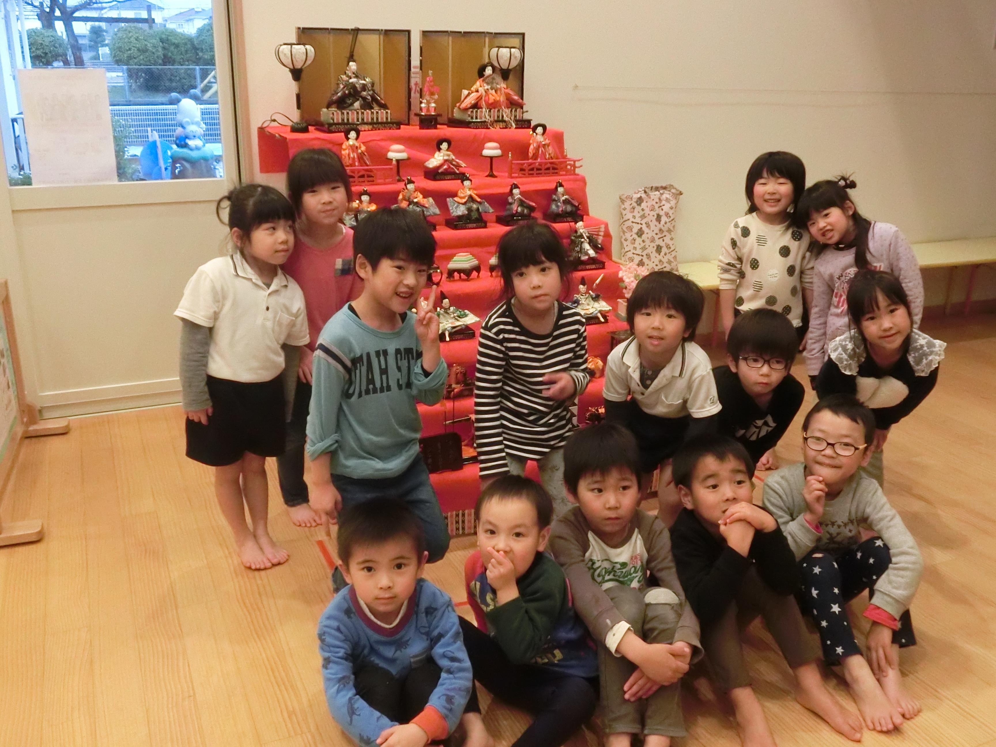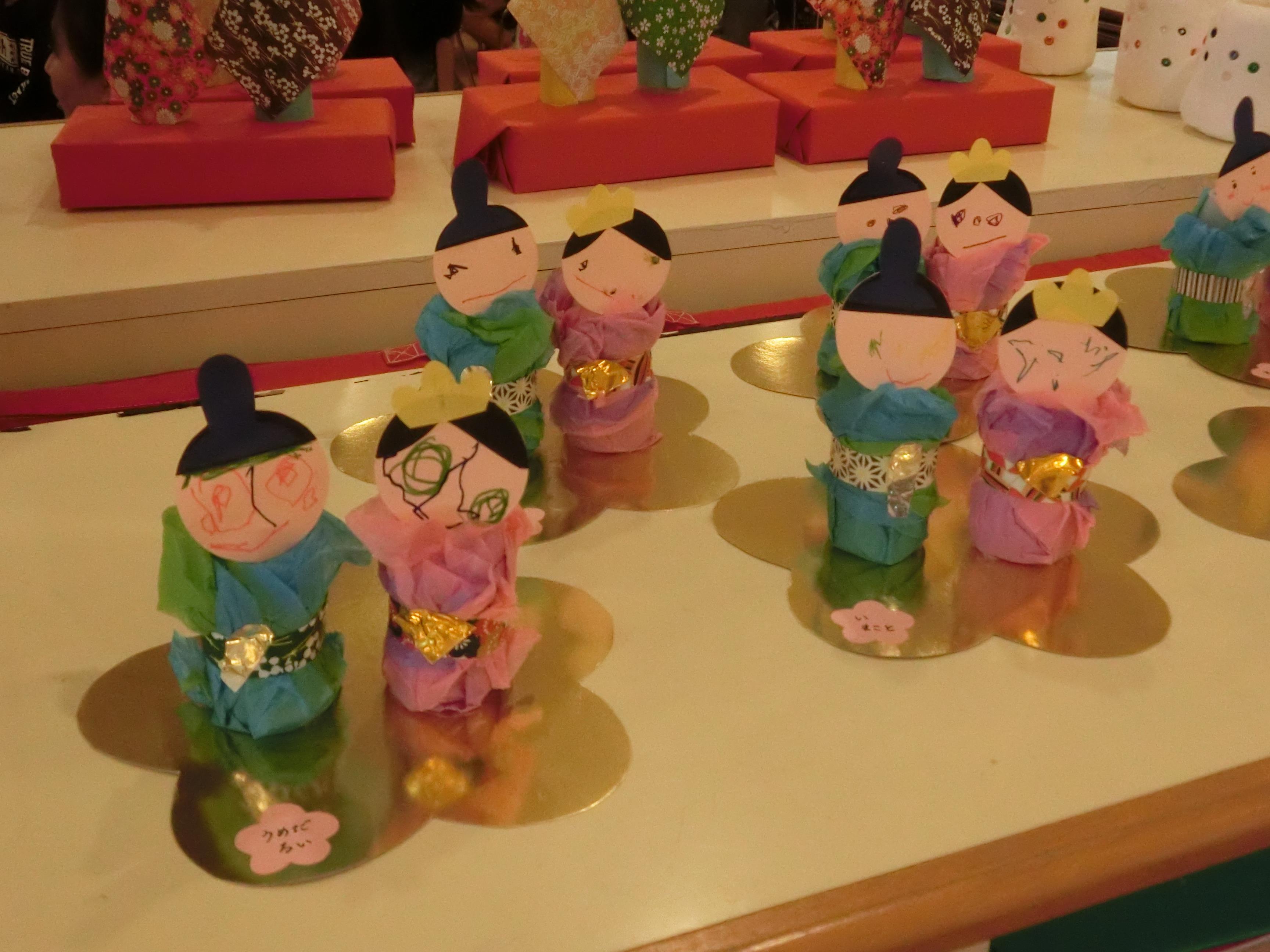 |  |  | | 5歳児。切り込みをいれて、ふくらみを持たせた着物です。結構難しかったようで苦戦していました。 | 姉妹園(第二幼稚園)の保護者様から、譲っていただいたお雛様。段飾りの立派な人形に子どもたちの目は釘付けでした。 | こども園に仲間入りした、お雛様たち。これからずっと子ども達の成長を見守ってください。 よろしくお願いします。 |