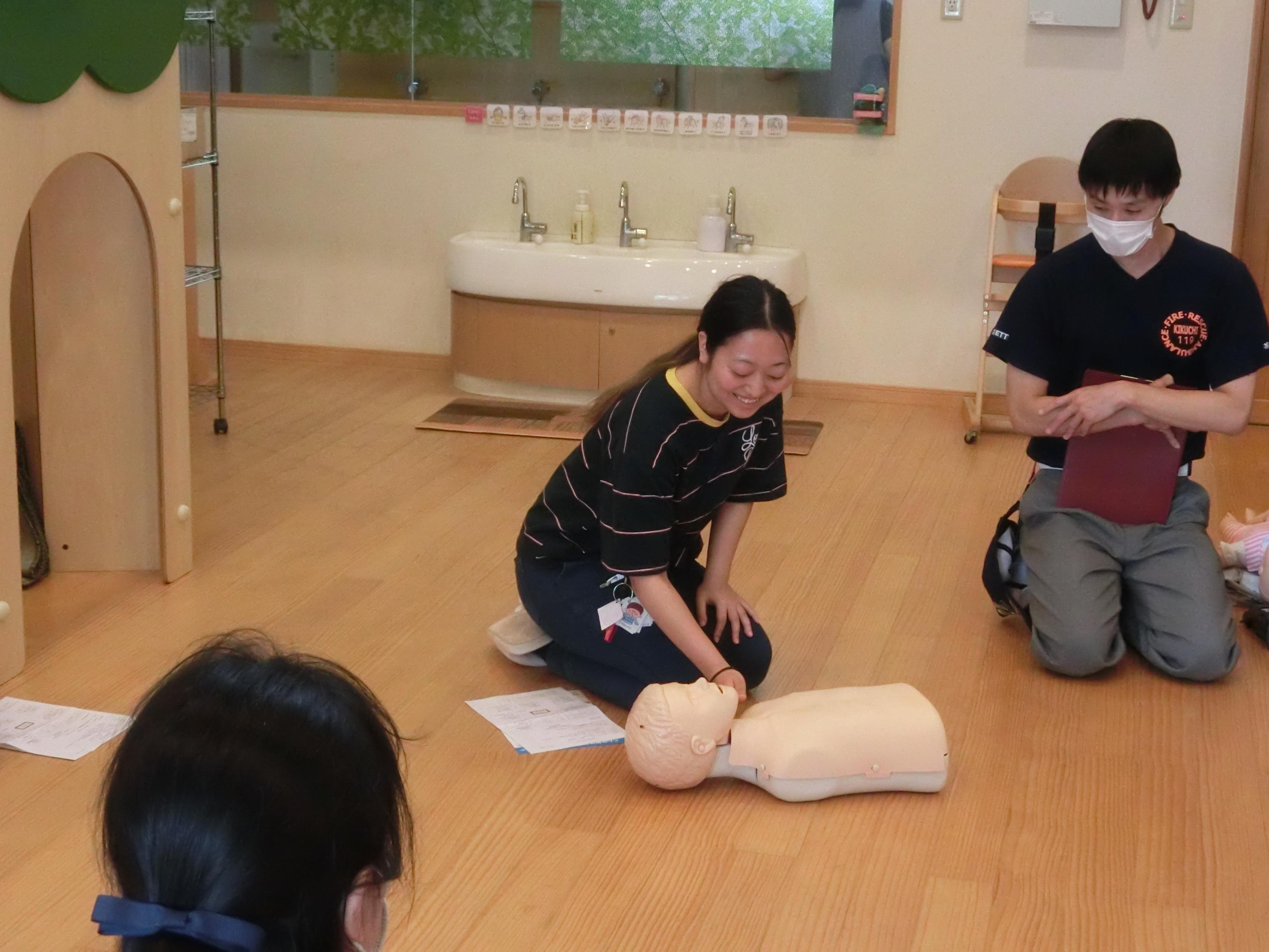 今年度も水遊びを前に、職員研修として「救急法」を学ぶ機会を計画しました。新型コロナ感染防止対策中とあって、例年通りの研修は出来ませんでしたが、代表の先生の取り組む姿に自分だったら!と重ね合わせ参加することができました。 水難はわずか10センチの水でも起こります。あってはならないがもしもに備えることは、安全に活動する基本です。学童や補助の先生方も一緒に参加していただきました。もしもの時は訓練時みたいに落ち着いて行動することは難しいと消防職員の方にも聞き、「大きな声で呼びかける」「みんなで助ける」ことが何より大切だと学びました。 これから、暑い季節を迎えます。楽しく安全に涼を味わっていきたいと思います。  |  |  | 多目的室に全員集合(見守りの職員と交替です)真剣に話を聞きました。 | 「大丈夫ですか?トントン」 意識の確認。ちょっとドキドキします。 | 次は呼吸の確認。 午睡時0歳児の呼吸も確認していますが、人形は確認が難しいです。 |