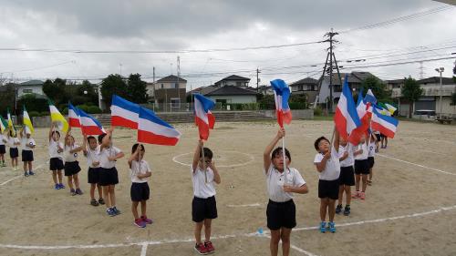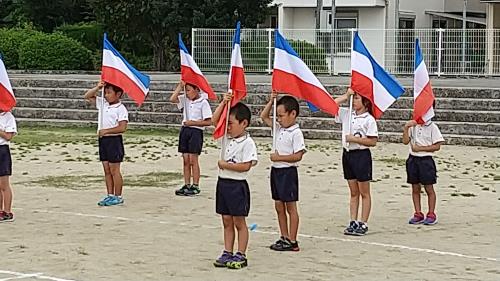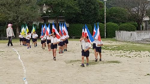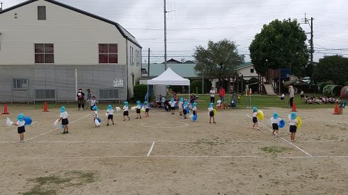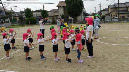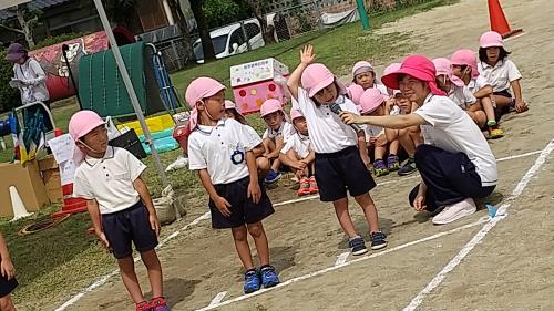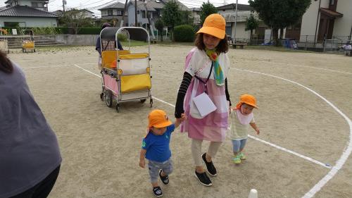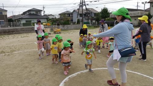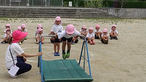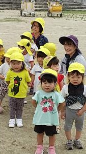 9月26日の運動発表会にむけて、全体予行練習を行いました。今年度は感染予防対策を検討し、二部構成にしたり、参加制限を行う中の開催となります。保護者の皆様には、応援参加制限についてご理解頂き感謝しております。本部側から応援していただけるよう、観覧場所も検討しております。 どうぞ子どもたちの目標に向かって頑張る姿を応援お願い致します。 予行練習では、お客さんとして他のクラスのお友だちが応援したり、拍手を送ってくれました。年長さんの鉄棒やマーチングを見た3歳児さんは思わず「すごいね」と感じたままをつぶやく姿がありました。みんなで認め合うことが、自信につながり、次への意欲の育ちとなります。すごいねとつぶやいたお友だちも自分の発表では、伸び伸びと参加していました。 「認めあう関係」を大切にこれからも様々な活動にチャレンジしてまいります。 当日をどうぞ楽しみにされて、ご参加ください。  |  |  | | 0歳児さんも歩行が出来るお友達は先生と入場です | 2歳児さんは「バデイ2人組」で堂々と入場してきました。 | 1歳児さんも合志こども園園歌を歌えます。 |