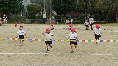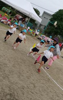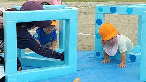 |  |  | | 3歳児は未満児のお手本となって、間隔も意識しながら並ぶことができています | 3歳児かけっこ ゴールテープ目指して元気いっぱい走ります | 0歳児競技 海に見立てたお手製トンネルをくぐります。体をしっかり支えて通り抜けました |