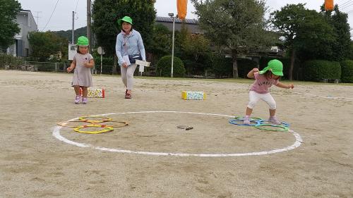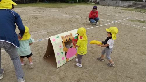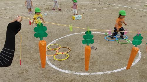 |  |  | 1歳児競技 平均台に見立てた橋を渡ってりすさんに食べ物をどうぞとします。ストーリーに中で、体を動かすことを楽しみます | 2歳児競技 目と足の協応に言葉のリズムをつけて、グーパー飛びが上手になりました。しっかり見て跳んでいますね | 2歳児競技 うさぎになりきって、最後はにんじんゲットです。高さのあるジャンプにも挑戦します |