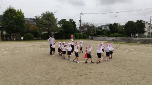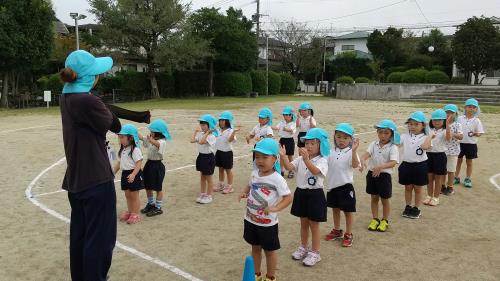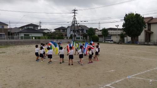 |  |  | 5歳児 表現 ポイント置きは子ども達の担当です。真っ直ぐになっているかみんなで声を掛け合って準備しました | 5歳児 表現 ガードを手にしたと同時に、発表は始まっています。一人一人の意気込みがガードを持つ姿勢に現れています | 5歳児 表現 号令をまってスタンバイ! きりりとした姿、みんなの気持ちも一つになっています |