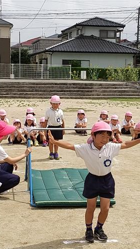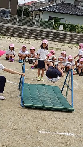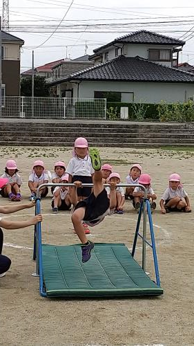 |  |  | 5歳児 チャレンジ 年長になって自ら取り組んできた逆上がり。おもいっきり蹴り上げるところが難しいですね。 | 5歳児 チャレンジ 自分で頑張った後は「ポーズを決めて!」やりきった表情は自信に溢れています | 5歳児 チャレンジ 今頑張っていることを発表する場です。足抜き回りでも後ろに回るのでドキドキするようです |