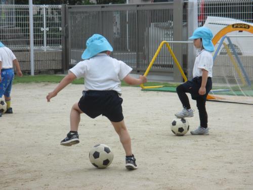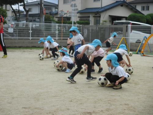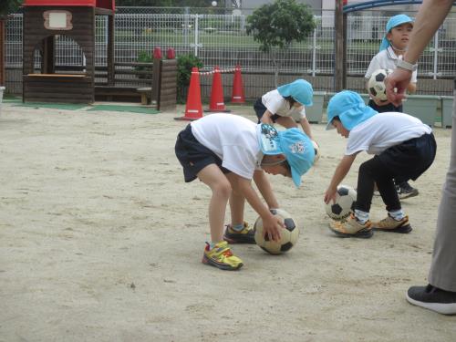 今年度も「SKT合同ロアッソサッカー教室」に取り組んでいきます。 月1回の教室ですが、例年園庭を所狭しと駆け回ってはサッカーに触れ「体を動かすことを楽しむ」「ルールある競技を知り、友だちと協力し合うことの楽しさを味わう」事をねらいに実施しています。例年は杉並台保育園のお友だちと共に、杉並台幼稚園の園庭で行っていますが、コロナ感染拡大防止対策とし、今月は別々に行いました。今後状況によっては、SKT合同実施も計画されています。 もっと広い園庭で、もっと沢山の仲間とサッカーが出来ることを願いながら、第1回目の教室に参加しました。 様々なことに挑戦しながら、自分の得意なことを見つけていくことができるきっかけとなって欲しいと願っています。 休日、親子でボールを追いかけるのも、きっと子ども達の心にいい思い出ととして残ると思います。  |  |  | 上から下に強く落として (バウンド)キャッチ! なかなか自分のところに落ちてこないから難しかったよ。 | 手をのばして、下にするのはどうかな?先生ともやり方を考えてみました。 | ボールと仲良しになるため、最初は手で転がしていくよ。ボールと散歩。 いろいろな様子が見られますね。 |