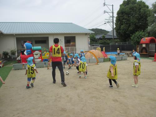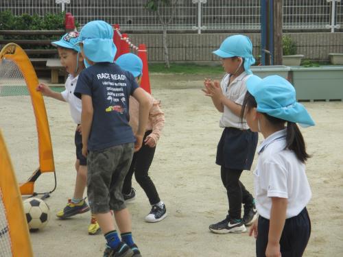 |  |  | ゴールの練習もしました。 自分のボールが決まって思わず拍手をして喜んでいました。目標にむかって成功する体験を通して、意欲や挑戦する気持ちを育んでいきます。 | いよいよ2チームに分かれて試合にチャレンジしました。ボールを追いかけたり、相手ゴールをめざしして思いっきり走り回りました。 | これから試合を繰り返しながら、パス回しも体験してチーム競技の楽しさを味わい、様々な競技にチャレンジするきっかけとなることを期待しています。 |
