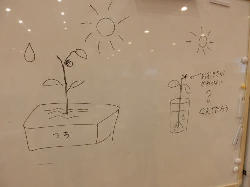 |  |  | 【土にあって水にないもの】 ホワイトボードを使って、違いを見える化して考えました。 どうも、土に何か入っているのかも知れない!となり、土作りの話を思い出し、鶏糞や肥料の事に気づきました。 「栄養だ!!」 | 【栄養になるもの有りますか?】 植物用の栄養剤を使ってみることにしました。植物が好きな園長先生も「これでいいのかな?」と一緒にチャレンジすることにしました。 | 【土の中の根っこは茶色?】 お家で草取りをした経験から「雑草も白い根っこだったから、どの植物も白いと思う」と熱弁してくれました。「そういえば玉ねぎを採った時も白かったよ」体験のつながりを感じました。 |