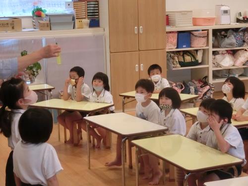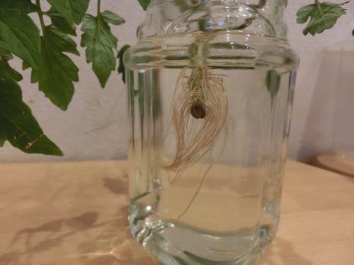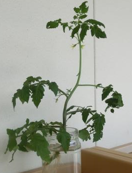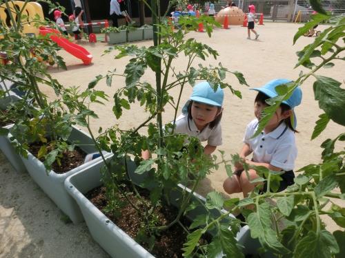 【折れたトマト!次は赤い実だね】 みんなで大切にお世話をしている、トマトは順調に根っこを伸ばし花も咲きました。さあ次は実がぐんぐん大きくなっていく番です。 しかし、写真に実が見えますか。花芯にちいさな実のあかちゃんは見られますが、一向に育っている様子が見られません。どうして大きくならないのか、クラスで話し合いました。プランター栽培との違いから想像したり、図鑑を開いてみたり。さあ!何が必要なのか子ども達は見つけたのでしょうか。  |  |  | 【太陽が必要】 プランターとの違いは、外と室内で育てている事。という意見がでて、その日から靴箱の上に置いて様子を見ることにしました。 | 【根っこが茶色に!】 外におくことで、苗の環境も不安定になります。風に茎がなびいて、根っこが水に浸からず、枯れる寸前でした。 根っこも茶色になってしまいました。 | 【プランターのトマトは直ぐ大きくなる】 「昨日よりも、また少し膨らんでた。」毎日観察しているので、ちいさな変化にも気付く子どもたちです。 |
