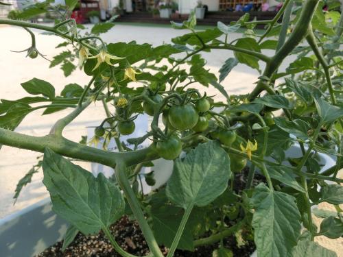 |  |  | ちいさな白い実見えますか? 「ぜんぜん大きくならないね」「やっぱり土の力が必要なんだよ!」ということになり、プランターへ植えることになりました。 | 赤い実の生長を願いながら、お当番さんが優しく植えてくれました。栄養入りの水も掛けるともっといいかも!と自分たちで考えながら植えました。 | 同じ苗の生長の違いを再確認しながら、緑のトマトの生長も楽しみにしていました。 |