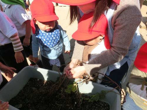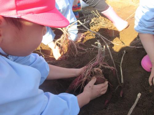 | みんなでうんとこしょ!どっこいしょ! どんな形も宝物です。優しく掘りました。 | おいもはどこだ~ プランターを覗き込んでは大騒ぎです。0歳児さんも先生と一緒によいしょ!と掘りました。 | 勢いよくあちこちで彫り上げられるため、1歳児のスナップとれなかったよ。 隣のプランターで掘っています。 |