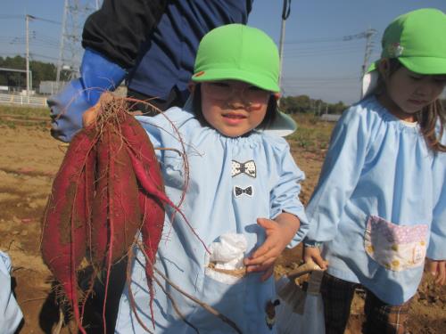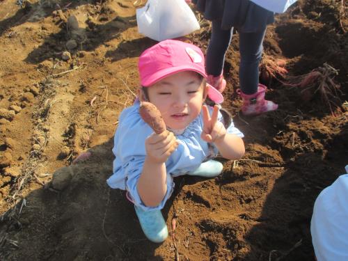 | 顔と同じくらいのお芋だよ! おもた~い。 | 頑張ったでしょう!! ちょっと疲れちゃった。 | かわいいお芋とにっこり! |
