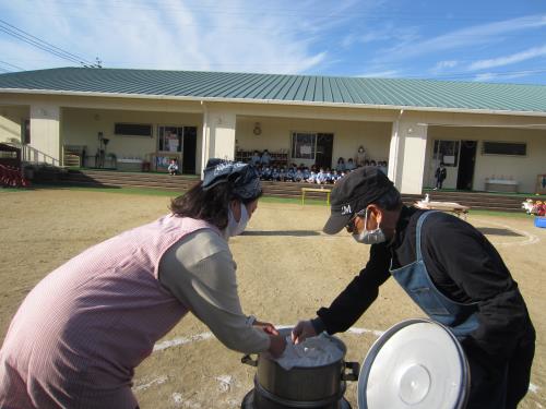 | | もち米を蒸し器に入れた様子も見ることにしました。蒸し布巾を敷いて米をいれること・真ん中をへこますことを知りました。 | お湯が沸いているお釜にのせて蒸します。 火加減、蒸しあがり具合をみながら進めます。 | 勢いよく煙をあげて、薪が燃えていきます。 火の様子を見ることが大切です。 |