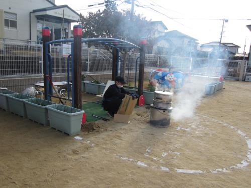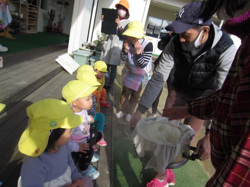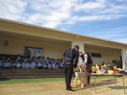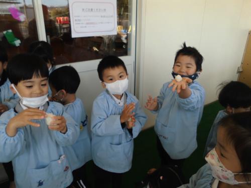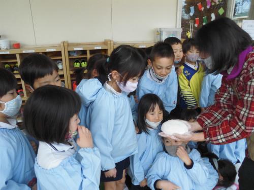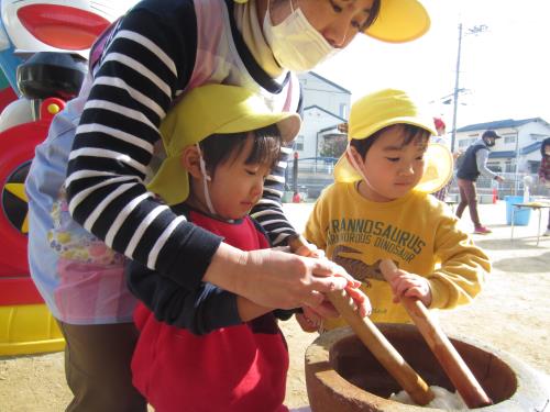 | 例年SKT合同で行っている「もちつき」ですが、今年度も新型コロナ感染拡大防止対策を考慮し、自園で開催しました。 園庭の一角でかまどで火をおこし、薪のにおいに「園長先生!おもちつきの準備してるんでしょう」「けむりのにおいがするよ」と登園して直ぐ、準備の様子に気付き声をかけてくれました。 伝統行事を体験するなかで、便利になったものに気付いたり、昔の暮らしを想像したり、一つの体験からいろいろ学ぶことが出来ました。 例年通り「年長もちつき体験」とともに「ミニもちつき」を他学年児は体験しました。柔らかいつきたてのお餅は一人一人に分けられ、感触を楽しみました。中には優しく包み込んでいるうちにくっついてしまい、大変なことになっている場面もありました。 もちつきを五感で楽しむことが出来ました。