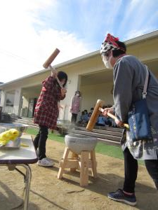 | 米が蒸しあがりました。 湯気から香ってくる、もち米の香りも嗅いでみました。 | お正月飾りの餅を一番につきます。子どもたちの「よいしょ」の掛け声で、先生も頑張っていました。 | 仕上げは、男の先生方の力を借りて粒が残らにようにしっかりついていただきました。 |