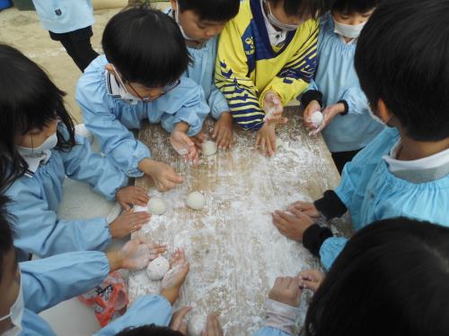 | | こんなにまーるくできたよ。 | 小っちゃくてもコロコロすれば丸くなるんだよ | 2歳児さんのもちつき! つくより、こねこねがたのしそうです。 |