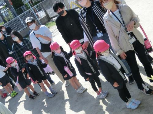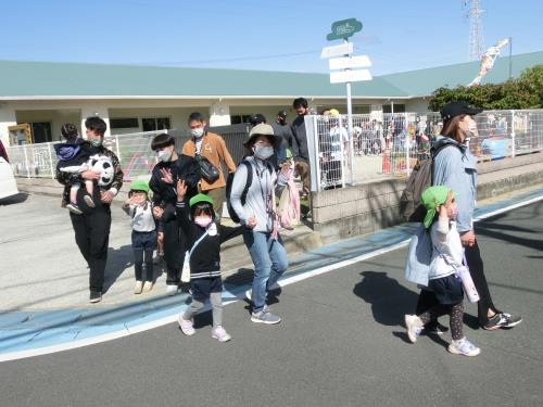 | | 出発前の集まりで、「日ごろどのように散歩や園外活動に取り組んでいるのか」今日は体験してください。と伝えました。 | 保護者と手をつないで出発です。 大人が車道側につきます。 いつもは守ってあげる役目の年長さんも今日は守っていただき嬉しそうです。 | 土曜のお休みを調整して、お父様方も沢山参加されました。園行事への参加に感謝いたします。 楽しんでください。 |